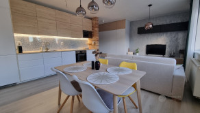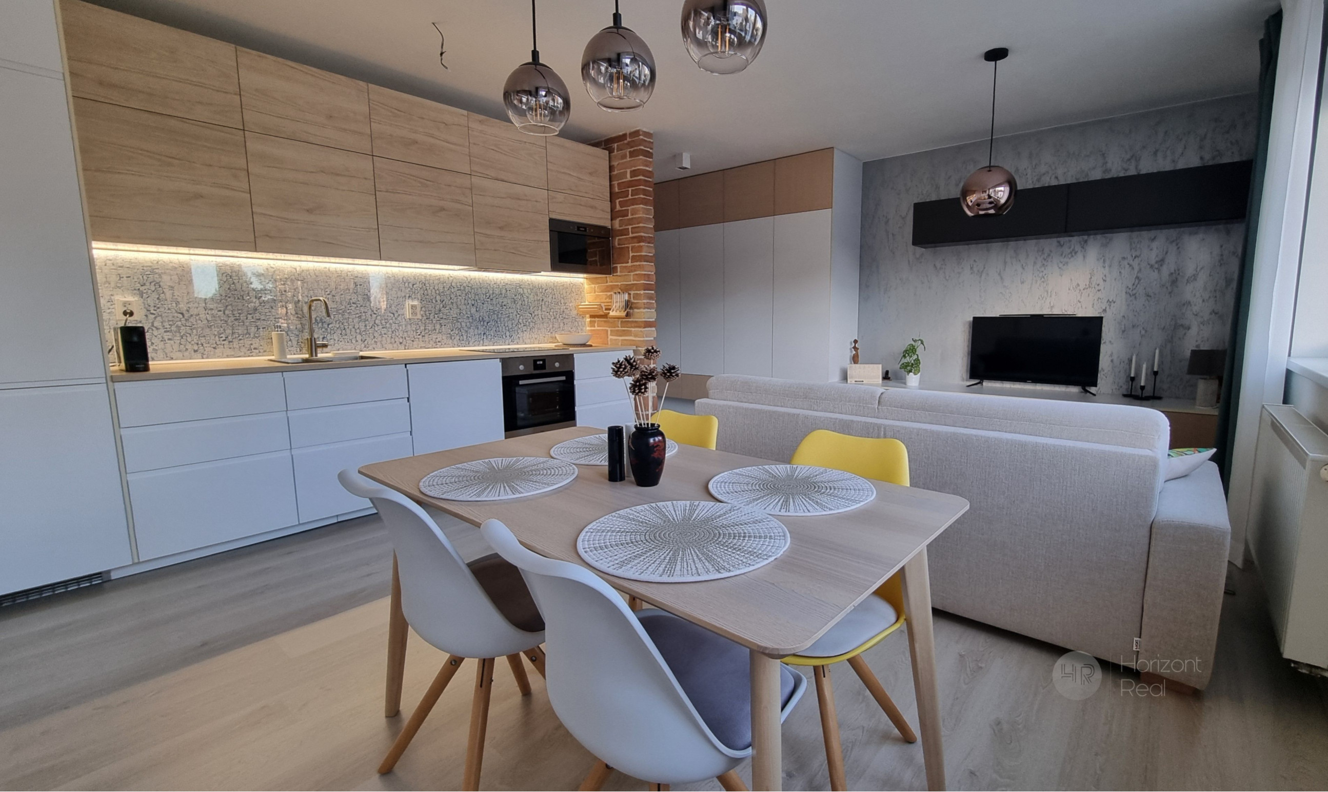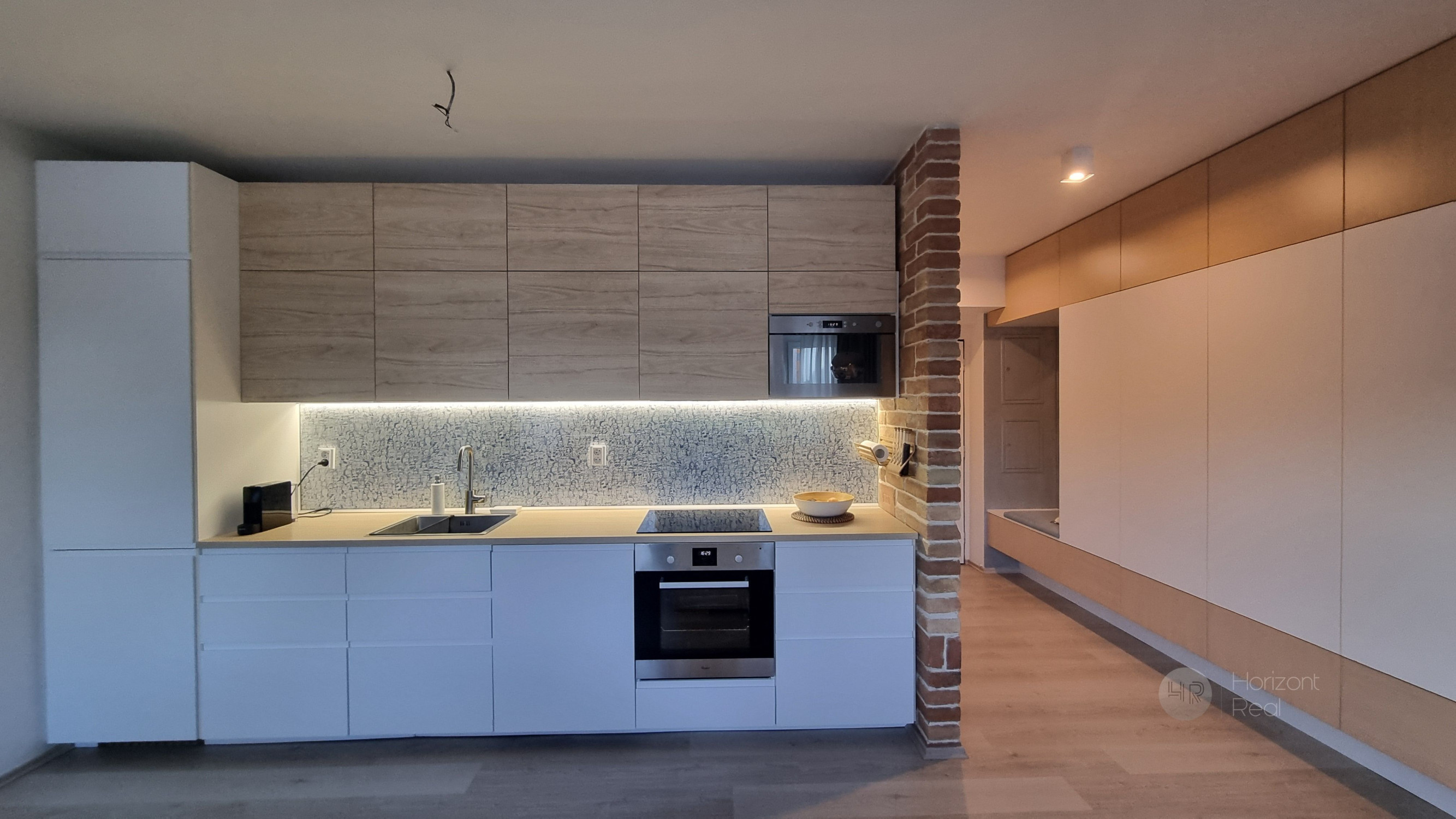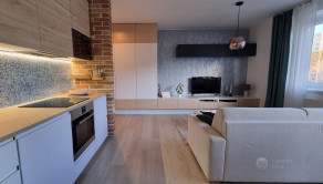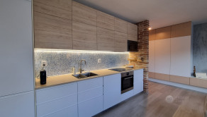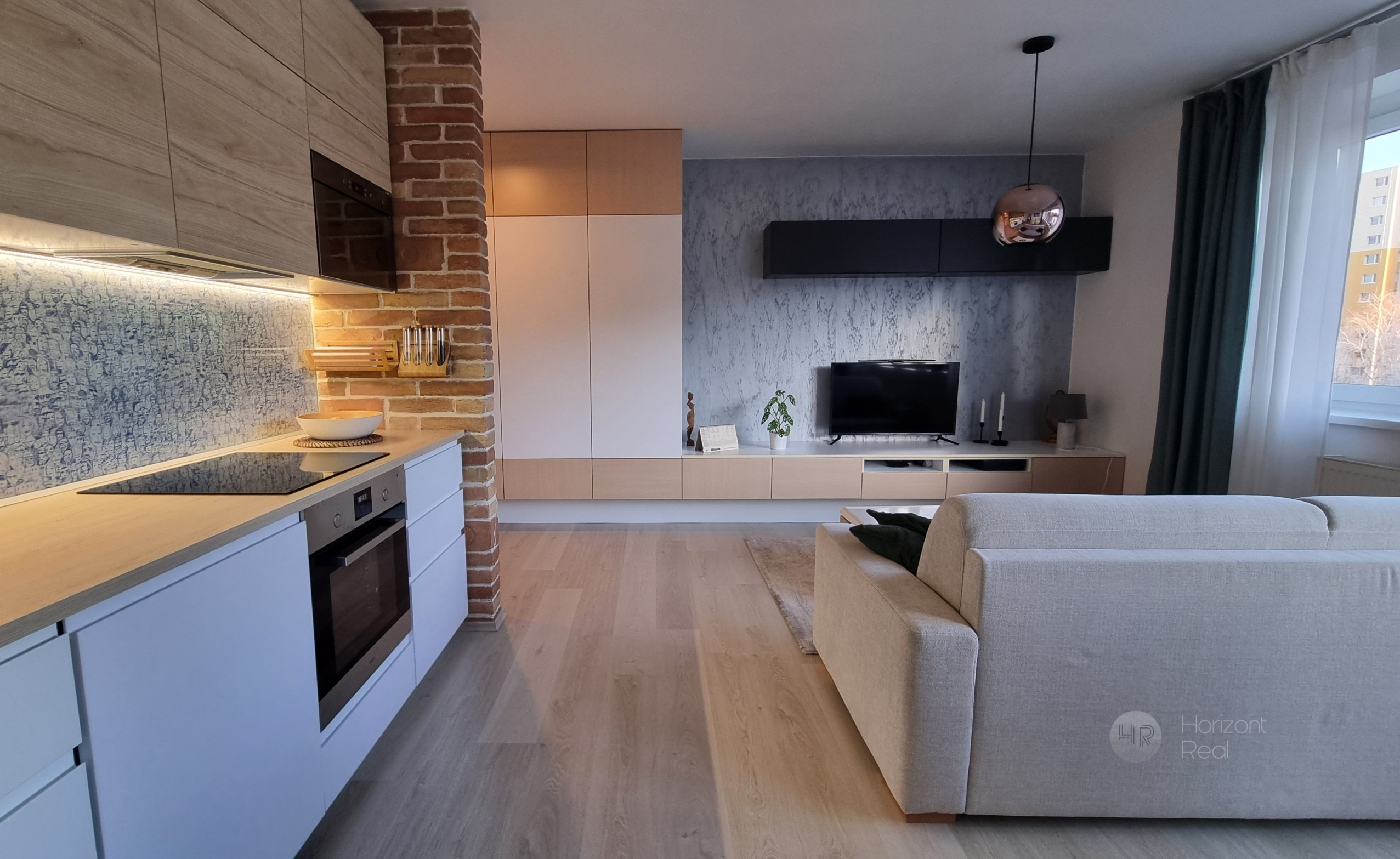 • Denná časť: Otvorený priestor obývacej izby prepojený s kuchyňou. Kuchynská linka je vybavená zabudovanými spotrebičmi.