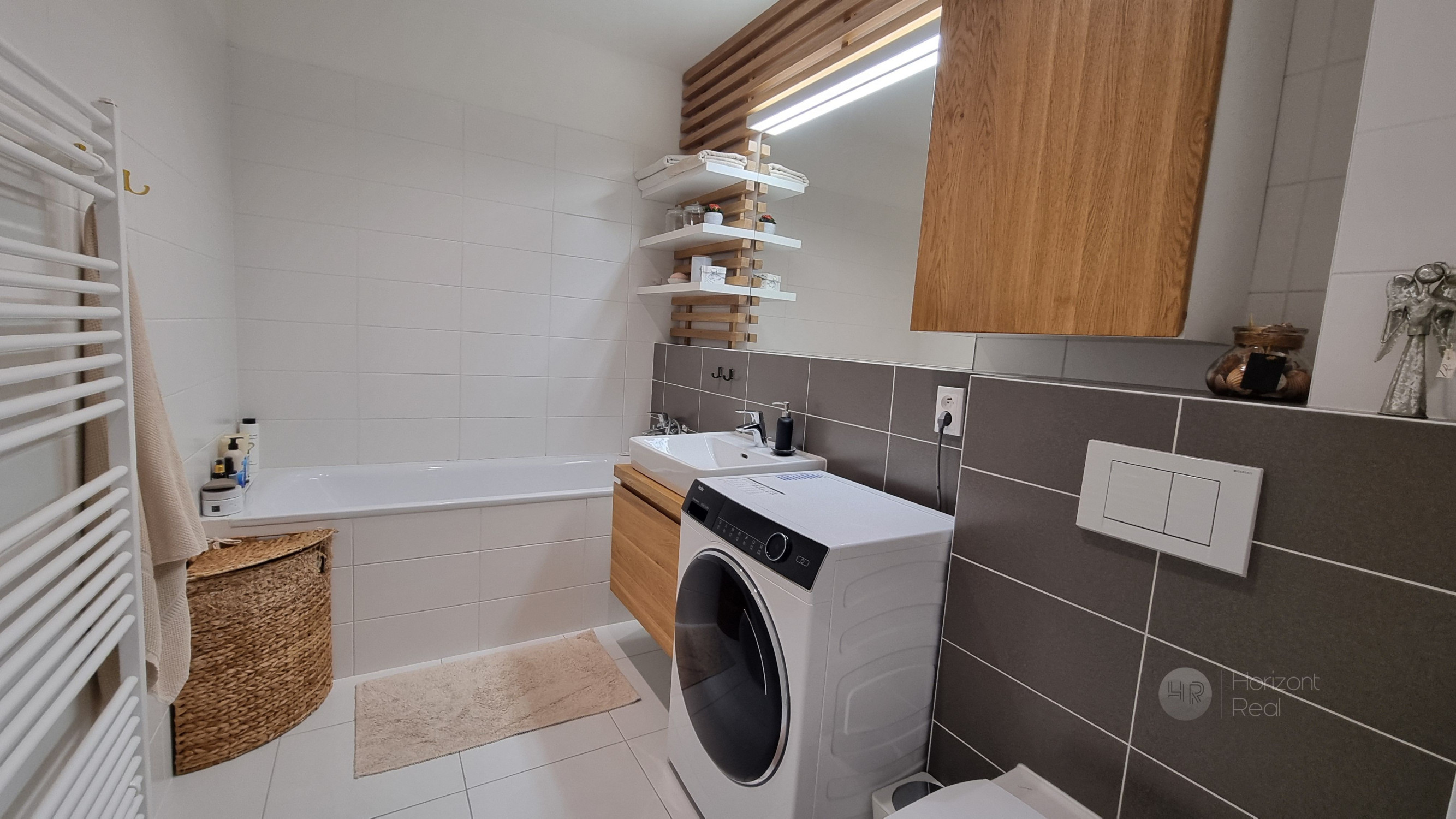 Tento byt bol navrhnutý interiérovým dizajnérom s citom pre čisté línie a nadčasovú estetiku. Celý priestor je harmonicky zladený v jemných prírodných odtieňoch a bielej farbe, čo v kombinácii s juho-západnou orientáciou vytvára mimoriadne svetlý a vzdušný domov.